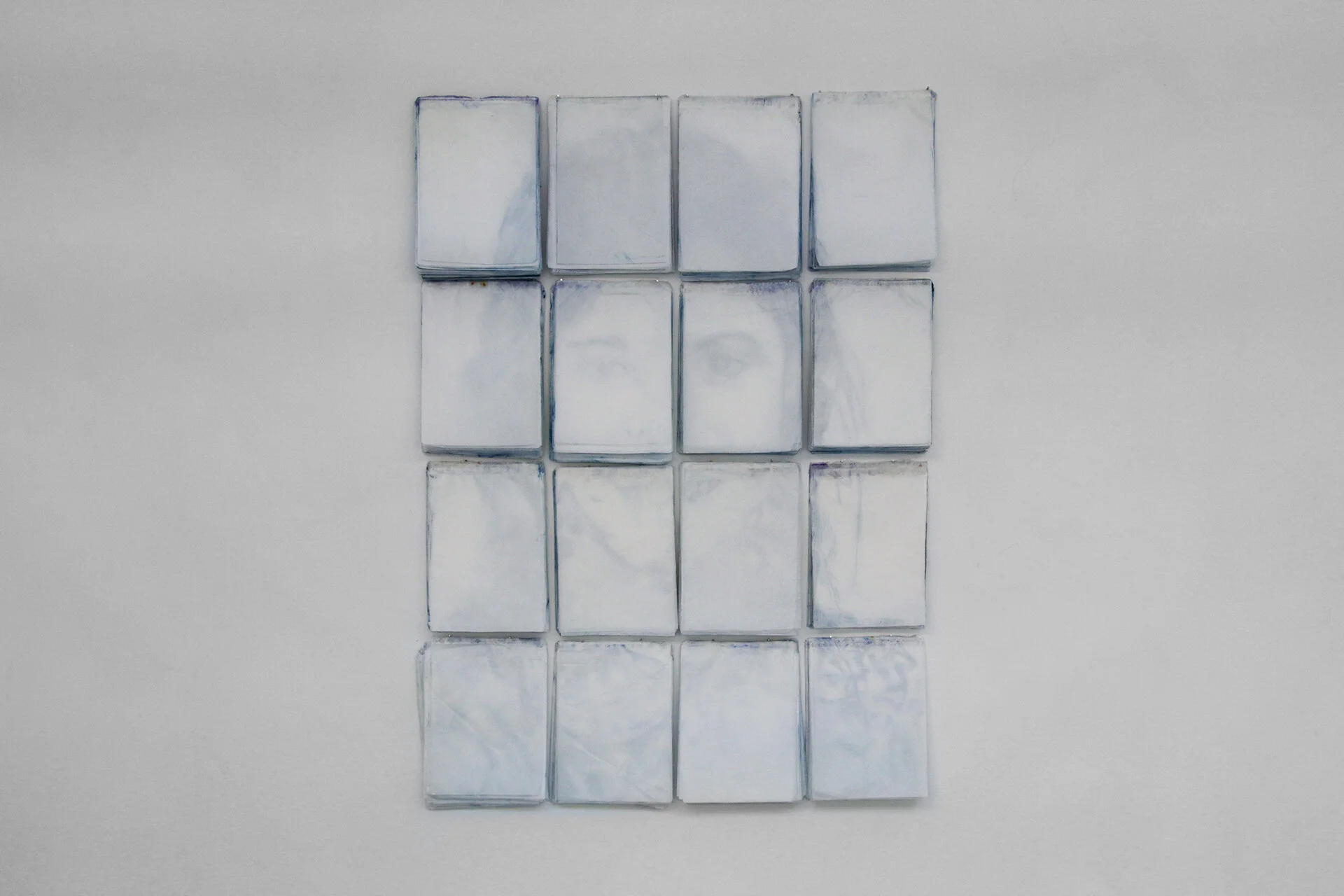 Each piece, made of silk paper, is placed one next to the other, together creating a whole. They were made by hand by repeatedly duplicating an image. Two techniques were utilized; the first was a drawing on paper with carbon paper underneath, the second used paint applied to paper which then bled through to the layers below. The pages were bound together into notebooks, partially transparent leaving an obscure image.